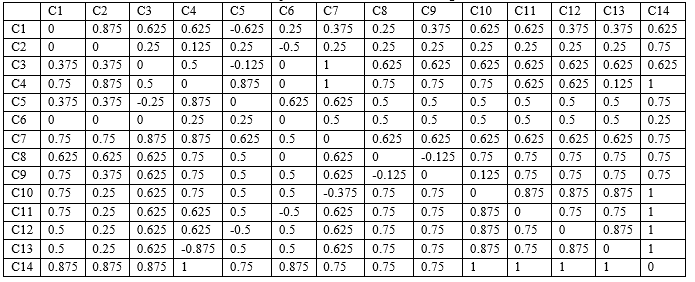 Vector de correlación expresado por los expertos Los valores agregados emitidos por los expertos agrupados mediante la matriz de adyacencia, conforman las relaciones con los pesos de los conceptos, a su vez se conforma el FCM (White & Mazlack, 2011).