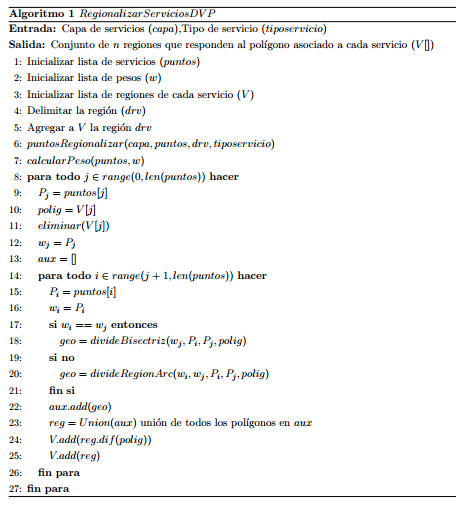 Para la obtención de los pesos asociados a cada servicio, se debe utilizar una función que tenga en cuenta los indicadores a partir del problema que se desea a resolver. A partir de los elementos descritos se propone el algoritmo 1 para la regionalización.
