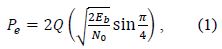 La modulación QPSK emplea la mitad del ancho de banda en comparación con la modulación BPSK con la misma velocidad de transmisión o transmitir al doble de la velocidad, aprovechando todo el ancho de banda del sistema GFDM (Chirag, Lohith, y Prashantha, 2017). La probabilidad de error está dada por la ecuación (1):