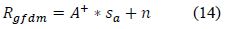 como la varianza (Jardak, Ahmed, y Alouini, 2012), la matriz H representa la matriz del canal de dimensión MN x MN y Y es la matriz de transmisión del sistema GFDM con dimensión MN x MN. La detección ZF es aplicada a la matriz A+ de dimensión MN x MN que representa el producto de A+= H * Y cómo se muestra en la expresión (14):
