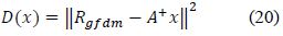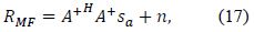 A partir de la expresión (13) es realizada la detección de Filtro Casado (Matched Filter, MF) al sistema GFDM para recuperar los símbolos transmitidos. El método de detección MF en la matriz es aplicada a la matriz A+ . El resultado de la aplicaci�n del m�todo de detecci�n al vector Rgfdm recibido, resulta la siguiente expresión: