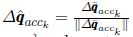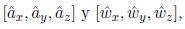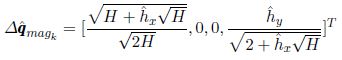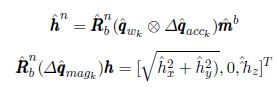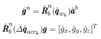 es la matriz de rotación evaluada en la orientación estimada, fb es el vector de las aceleraciones filtradas. El producto cartesiano es la corrección del efecto de la fuerza de Coriolis, y las expresiones los vectores