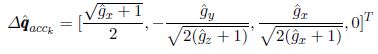 que se obtiene al rotar el vector de aceleraciones del marco del cuerpo al marco de navegación, con respecto al vector de gravedad real g = [0,0,1]T . Para calcularlo se hace uso de la matriz de rotaciones basada en el cuaternión