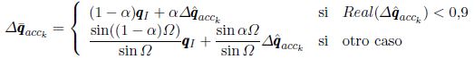 Dado que esta estimación está contaminada con ruido de alta frecuencia, se aplica un método de interpolación con el cuaternión unitario qI = [1,0,0,0]T . Tendrá dos expresiones, en función del valor de la parte real del quaternion