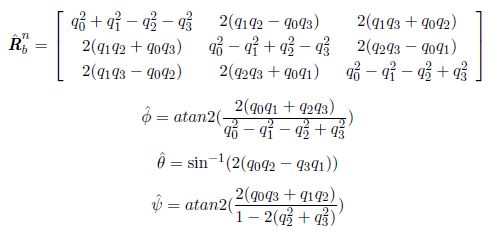 Estas propuestas fueron tomadas en cuenta porque se basan en el álgebra de cuaterniones, cuyas ventajas se abordan ampliamente en (Rogers, 2003) y (Diebel, 2006). A continuación se detallan las ecuaciones principales para estimar la orientación, siguiendo los desarrollos de (Valenti et al., 2015).