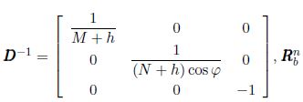 están expresados en el marco de navegación, ϕ es la latitud, λ es la longitud, expresadas en grados, y h la altura, en metros. Las ecuaciones diferenciales 18a y 18b se expresan en el marco de navegación según (Titterton and Weston, 2004):