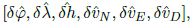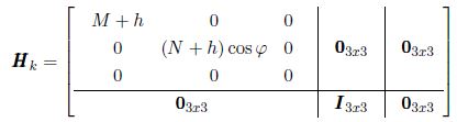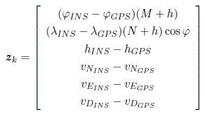 El vector de mediciones se conforma con la diferencia entre la salida de la solución inercial, y la información que proviene del GPS. Se adopta la modificación de multiplicar las diferencias en latitud y longitud por los radios de la Tierra, dado que están expresadas en radianes, son números pequeños que pueden generar inestabilidad numérica en la ejecución del filtro. (Hu et al., 2015)