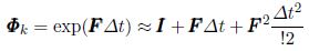 Esta es la matriz que describe la dinámica del error en posición y velocidad, según el desarrollo propuesto por (Shin and El-Sheimy, 2003) y (Falco et al., 2012). Φse calcula tomando los tres primeros términos de la serie de Taylor, según (Hu et al., 2015).