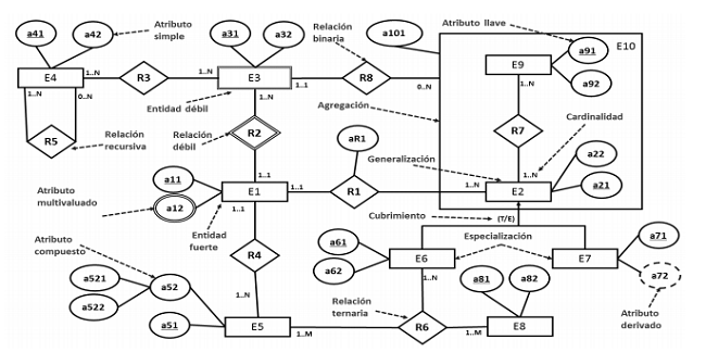 Los elementos que intervienen en un MER según (Mato, 2007), y que por ende forman parte de la teoría de diseño de BDR son mostrados en la Figura 1, a partir de la representación gráfica de los mismos