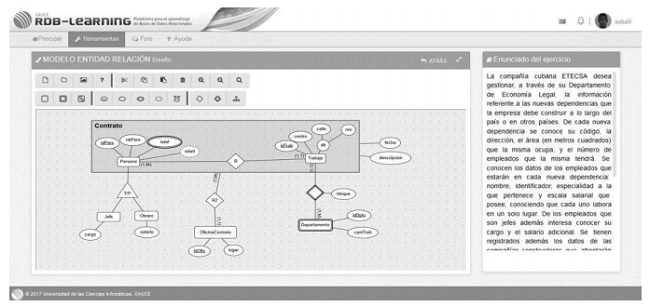 Se muestran a continuación la Figura 2 y Figura 3, interfaces de la plataforma RDB-Learning. Como se observa, el estudiante cuenta con una interfaz que le posibilita diseñar un MER o implementar alguna sentencia DML mientras analiza uno de los ejercicios disponibles en la plataforma.