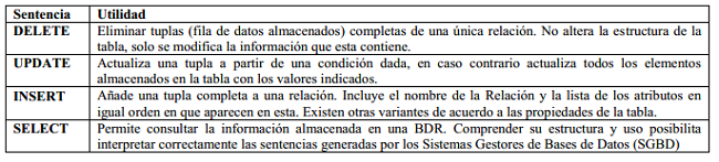 Una de las formas de manipulación de BD es a través del Lenguaje Estructurado de Consultas (SQL por sus siglas en inglés). Este lenguaje es considerado un estándar para interactuar con bases de datos relaciónales y es soportado por prácticamente todos los productos de base de datos actuales (Date, 2001). Para el manejo de los datos almacenados en BDR, se emplea el lenguaje de manipulación de datos (DML). Este incluye las 4 sentencias que se plasman a continuación (Colectivo de autores, 2011): Tabla 1