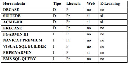 En la actualidad existen aplicaciones para el diseño de MER y manejo de BDR. Durante la investigación se realizó un análisis de herramientas con estos fines, mediante el cual se obtuvo el resultado que se muestra en la Tabla 1, a partir de los siguientes parámetros: