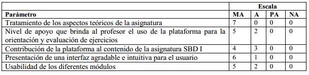 Para valorar la posible contribución de la plataforma RDB-Learning se realiza una consulta a un conjunto de siete (7) especialistas con experiencia en la impartición de la materia. La Tabla 2 resume el resultado de los juicios emitidos por los encuestados, en una escala de Muy adecuado (MA), Adecuado (A), Poco adecuado (PA) y No adecuado (NA), de acuerdo a los siguientes parámetros: Ver Tabla 3