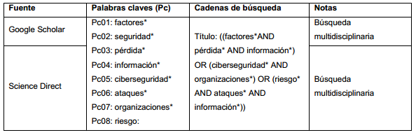 Bajo estas consideraciones, se seleccionó una base de datos como fuente principal de información, tal como Google Scholar; y para no limitar la búsqueda, el alcance se extendió a ScienceDirect. Para cada base de datos, se acondicionaron cadenas de búsqueda, con la finalidad de obtener precisión en cada consulta. Tabla 1