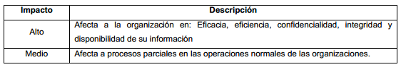 Para la asignación de los niveles de impacto de cada factor, se tuvo como base los criterios de información de COBIT (Carvajal, Cardona y Valencia, 2019) y de la información recolectada, lo que nos permitió categorizar problemas y riesgos, y el resultado de los mismos dio lugar a identificar el nivel de impacto de cada factor en las diferentes áreas de las organizaciones, tal como a continuación de detalla:Tabla 2