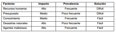 Es por ello, que producto de la revisión y de los factores causantes de pérdidas de información identificados, se ha considerado definir el impacto que causarían dentro de las organizaciones, en un nivel que va desde alto a medio, así como la frecuencia y la solución requerida para cada factor, tal como a continuación se detalla en la Tabla 4.