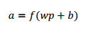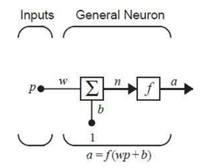 El siguiente proceso es simple. A la entra llega un escalar p que es multiplicado por su peso w, quedando w ∗ p, que es una de las entradas de la sumatoria. La siguiente entrada siempre tiene valor 1 y es multiplicado por un bias. Una vez ambos se han sumado se obtiene la entrada n a la función de transferencia w ∗ p + b. Finalmente se tiene la salida de la función a de la neurona: