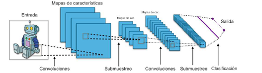 Una red neuronal convolucional según (Suárez, 2017) es un tipo de red multicapa que consta de diversas capas convolucionales y de pooling (submuestreo) alternadas, y al final tiene una serie de capas full-connected como una red perceptrón multicapa, como se muestra en la Figura 3.