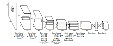 La arquitectura de la red del modelo está basada en GoogLeNet (modelo para la clasificación de imágenes (Santos, 2013). La red cuenta con 24 capas convolucionales seguidas de 2 capas con conecciones enteras (fully connected). Se utilizan 1 x 1 capas de reducción seguidas de 3 ∗ 3 capas convolucionales, similar a (Lin, y otros, 2016). También existe una versión más pequeña de YOLO pensado para lograr una mayor velocidad (con 9 capas en lugar de 24 y menos filtros en esas capas).Figura 4