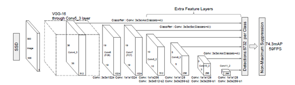 YOLO tiene dificultades para tratar con pequeños objetos en grupos, lo cual es causado por fuertes limitaciones espaciales impuestas a las predicciones de las cajas. Con el fin de resolver estos problemas, (Liu, y otros, 2016) propusieron un Single Shot Detector. Dado un mapa de características específicas, en lugar de las redes fijas adoptadas en YOLO, el SSD aprovecha un conjunto de cajas de anclaje con diferentes radios y escalas para discretizar el espacio de salida de las cajas delimitadoras. Para manejar objetos de varios tamaños, la red fusiona las predicciones de múltiples mapas de características con diferentes resoluciones. Dado la arquitectura de la red troncal VGG16, SSD añade varias características capas hasta el final de la red, estas son responsables de las predicciones para el balance de las cajas delimitadoras con distintas escalas y aspectos de radio, al igual que sus valores de confianza asociados.