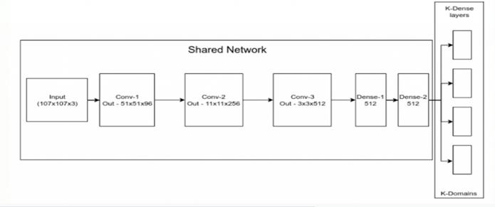 Multi domain network (MDnet) fue el algoritmo ganador del desafío VOT2015. Las redes neuronales convolucionales son computacionalmente muy costosas de entrenar, estos métodos tienen que utilizar una red más pequeña para entrenar a alta velocidad durante el despliegue. Sin embargo, las redes más pequeñas no tienen mucho poder de diferenciación. Una opción es que se entrene toda la red, pero durante la inferencia, se usan las primeras capas como extractor de características, es decir, solo se cambia el peso del último par de capas que se entrenan en línea. Así que se tiene a las CNN como extractor de características y las últimas capas pueden ser entrenadas rápidamente en línea. El objetivo es entrenar un CNN genérico multi dominio que pueda distinguir entre el objetivo y el fondo. Sin embargo, esto plantea un problema durante el entrenamiento, el objetivo en un video podría ser el fondo, situación que solo confundiría la red neural convolucional. Así que, MDNet hace algo inteligente: reorganiza la red en dos partes: la primera parte es la parte compartida y luego hay una parte que es independiente para cada dominio. Cada dominio significaría un video de entrenamiento independiente. Así que, la red se entrena primero en los dominios K de forma iterativa donde cada dominio clasifica entre su objetivo y su fondo. Esto ayuda a extraer la información independiente del video para aprender una mejor representación genérica del rastreador Figura 6(Nam y Han, 2013).
