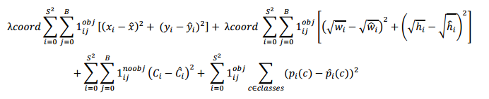 Donde 1obji denota si el objeto aparece en la celda i y 1objij denota la j cuadro delimitador predictor en l 1celda i, que es responsable de esa predicción (Redmon, y otros, 2016).