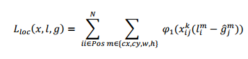entre los parámetros del cuadro de predicción (I) y los parámetros del cuadro correcto (g). Estos parámetros incluyen las compensaciones para el punto central (cx, cy), el ancho w y la altura h del cuadro delimitador. Esta pérdida es similar a la mejor en Faster R-CNN.