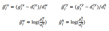 Donde x, y, w, y h denotan las dos coordenadas del centro de la región, ancho y alto. Variables x, xa y x son para la región de predicción, la región de anclaje y la región de aciertos respectivamente (igualmente para y, w, h). Esto puede verse como una regresión de la región delimitadora de una región de anclaje a una cercana región de acierto (Ren, y otros, 2015).