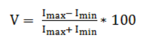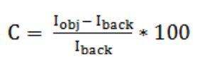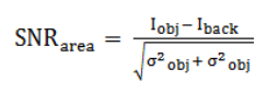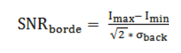 Donde I_obj e I_back son los valores medios de intensidad de una ROI dada y la región de fondo seleccionada respectivamente, σ_obj y σ_back son las desviaciones típicas de la distribución de I_obj y I_back en 1 y 3. Para 2 y 4, I_max e I_min son los valores máximos y mínimos del perfil medio de intensidad a través de un borde en la ROI seleccionado, y σback es la desviación típica de la distribución de intensidad de la región del fondo.