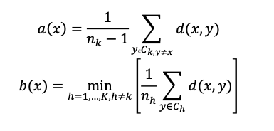 Donde a(x) en (5) es el promedio de las distancias entre x y todos los otros objetos en Ck y b(x) en (7) es el mínimo de los promedios de las distancias d(x,y) entre x y los objetos de los otros clústeres.