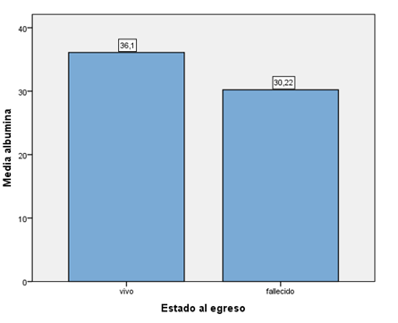 El nivel de albúmina de los fallecidos (30.22 mg/dl) está por debajo del valor considerado como normal (35mg/dl) a diferencia de los vivos (36.1 mg/dl) con un valor dentro del rango de normalidad (entre 35 y 45 mg/dl) (Figura 1).