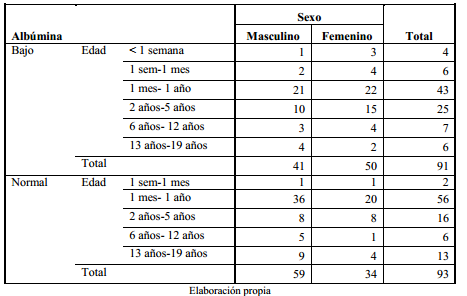 En la Tabla 1 se muestra la distribución de los pacientes según grupo de edades, sexo y nivel de albúmina. En la misma se puede apreciar que el mayor número de pacientes se concentra en el intervalo de un mes a un año con comportamiento similar en ambos sexos, con un total de 99 pacientes lo que representa un 53.8%. La cantidad de pacientes según los niveles de albúmina son similares por lo que estamos en presencia de la una base de casos balanceada.