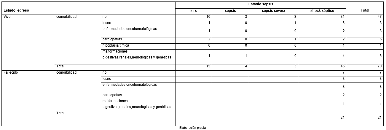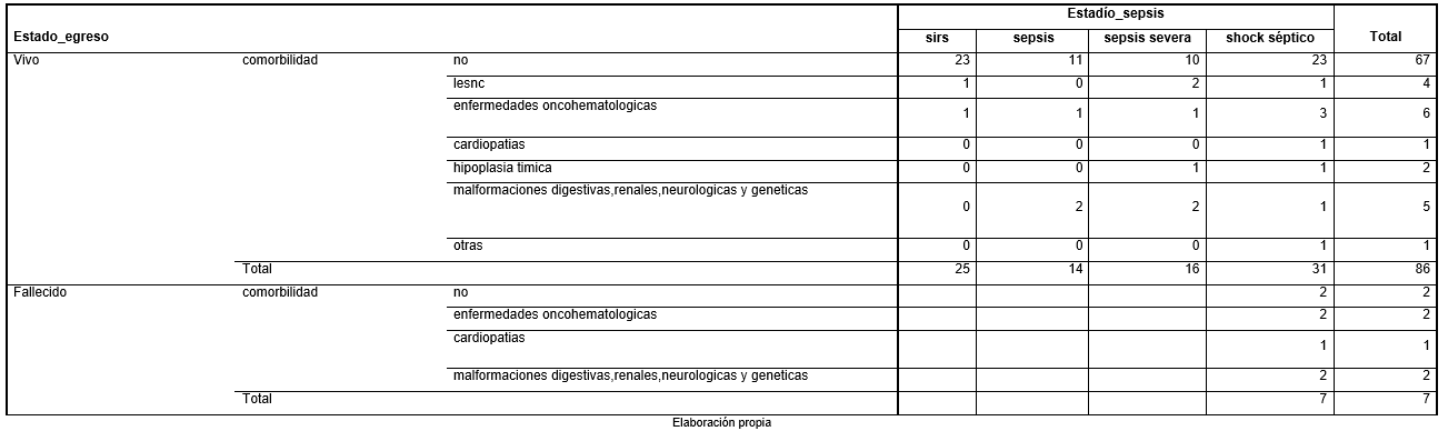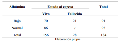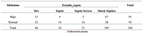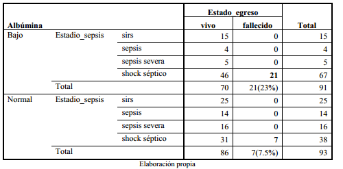 Palabras clave: nivel de albúmina, estadío de la sepsis, comorbilidades, estado al egreso, tablas de contingencia.