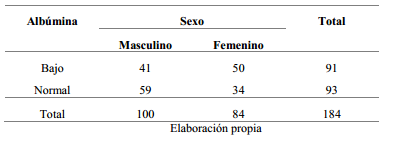 En la Tabla 5 se muestra el resultado de comparar el nivel de albúmina con el estadío de la sepsis a través de la tabla de contingencia y la prueba Chi-cuadrado. Realizando una interpretación estadística del problema puede concluirse que el test arrojó resultados significativos, por lo que existe relación de dependencia entre las variables presentes en el estudio. Lo mismo sucede con las variables estado al egreso y sexo (Tabla 6 y Tabla 7).
