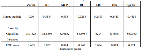 Aunque en el presente trabajo no se trata directamente con un problema de clasificación se quiso evaluar el comportamiento de algunos de los clasificadores presentes en el Weka utilizando como clase a la variable estado al egreso (vivo, fallecido). Un resumen se muestra en la Tabla 8 donde puede apreciarse que la combinación de los métodos Bagging y Random Forest tuvieron el mayor porcentaje de casos bien clasificados y una mayor área bajo la curva.