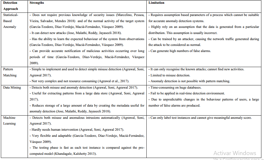 Statistical-Based Anomaly approach and the Data Mining approach generates high numbers of false alarms. This shows that these approaches can be considered to be less accurate as the number of false alarm rate should be low for the IDS to have high accuracy. With regards to accuracy, the Statistical-Based Anomaly approach is further not recommended for anomaly detection systems that need to be accurate as it does not provide high accuracy. Data Mining Approach is known to be not suitable to be applied to real-time detection environments. This is a limitation as intrusion detection needs to be detected early, requiring the IDS to perform tasks in real time.