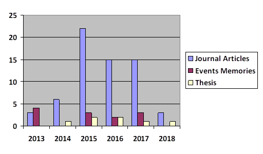 Figure 1 shows the number of publications during the period analyzed, from 2013 to August 2018. The year 2015 stands out for the number of publications (24.36 %) of the total of the published works during the period of analysis, after this year the researches and scientific publications decreased visibly. In 2014 the published works about forecast models are minimal in comparison with the rest of the years of the period studied and during 2018 only 4 works were identified up to the date of carrying out this research. Scientific journals were the most widely used publishing media (77.11%), followed by scientific event memories (14.28%) of total publications.