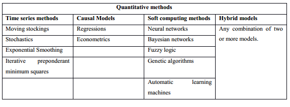 Quantitative methods bases their analysis on past data to make future forecasts (Derks, 2015; Garcete et al., 2017). According to Kumar et al. (2013), quantitative forecasting methods are classified into traditional methods, modified traditional methods, and soft computing methods. Sivanandam and Ahrens (2015), considers that quantitative methods are grouped into causal models, time series techniques and hybrid models. Morales (2016) classifies quantitative methods into time series analysis methods, causal models, and soft computing methods. In their study Tugay and Gündüz (2017) classifies quantitative methods into statistical models, artificial intelligence models and hybrid models.