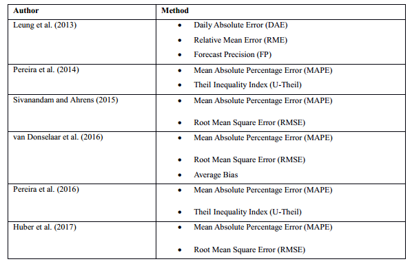 Table 2 shows the methods used in the literature to calculate the accuracy of the models proposed by the authors. The most commonly used methods for calculating the accuracy of the models were the Mean Absolute Percentage Error (MAPE) and the Root Mean Square Error (RMSE).