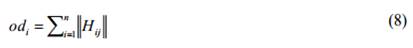 El grado de salida (od) representa por su parte un arreglo de valores que expresa una función de comparación de un indicador Hj respecto al resto de los indicadores Hi tal que Hi expresa el desplazamiento horizontal sobre los elementos recorridos por i, se obtiene mediante la siguiente ecuación.