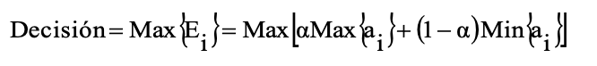 =3 representa un estado medio conocido como criterio de Hurwicz. Propuesto por Hurwics en 1951 (HURWICZ 1957), se puede considerar como una combinación entre el criterio optimista y el criterio pesimista. Consiste en ponderar un coeficiente de optimismo y otro de pesimismo al mejor y peor caso respectivamente, se suman los dos valores y se escoge aquella alternativa que proporcione un mayor resultado. Se formula tal como muestra la ecuación 6:
