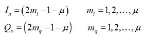 In M-ary QAM, the modulating data signal varies the phase and the amplitude of the carrier wave to one of M states. To generate the In and Qn amplitude, discrete levels belonging to this modulation, the transmitted symbols are partitioned into two streams of equal length. Each obtained subsequence is converted into an amplitude discrete level that forms a set of µ possible amplitudes. The obtained amplitudes from each subsequence are taken as In and Qn levels and are represented by