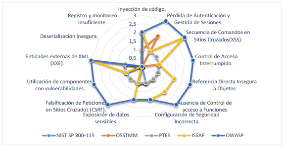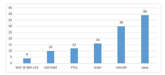 Como se muestra en la tabla 2, ninguna de las metodologías estudiadas abarca la evaluación completa de las principales vulnerabilidades en las aplicaciones web. La Guía de pruebas de OWASP es la que presenta un nivel de completitud mayor (76%), le siguen ISSAF (41%), PTES (31%), OSSTMM (26%) y finalmente NIST SP 800-115 (10%). Esta comparación puede apreciarse en la Figura 1, donde se compara con el patrón ideal con un valor de 39 puntos según el instrumento diseñado.