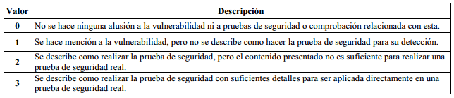 Durante la caracterización de las principales metodologías de pruebas de penetración, se desarrolló un análisis cualitativo respecto a los principales requerimientos de seguridad en las aplicaciones web. Para profundizar dicho análisis, se creó una escala de evaluación cualitativa (Tabla 1) para analizar cómo se abordan las vulnerabilidades más frecuentes en aplicaciones web. Los resultados de la aplicación de la escala de evaluación se enuncian en la Tabla 2.