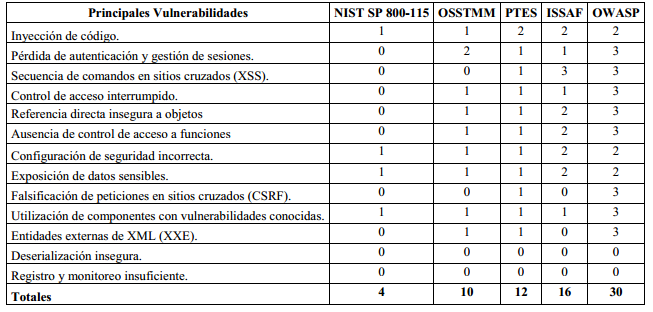 Atendiendo a que los reportes de OWASP son ampliamente referenciados en la literatura científica (Bhandari, Jaballah, Jain, Laxmi, Zemmari, Gaur, Mosbah and Conti 2017; Singh and Chatterjee 2017), se tomarán estos como indicadores para compararlos con las metodologías de pruebas de penetración actuales, cuestión que se aborda a continuación.