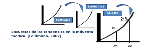 Por otra parte, se emplean cada vez en mayor medida en todo el mundo las tecnologías informáticas en la industria de equipos y dispositivos médicos, que a su vez reporta también un constante crecimiento. Encuestas de las tendencias en esa industria técnico médica indican que “el software es uno de los factores más decisivos para la producción innovadora de productos con nuevas capacidades, y prevén que la importancia del software aumentará más en el futuro”. A medida que el papel del software en los equipos y dispositivos médicos aumenta en importancia, también lo hacen los fallos, debidos a defectos de software. Una encuesta alemana sobre dispositivos médicos en el médico sector indica que el software es la principal causa de los riesgos relacionadas con defectos de construcción y diseño de equipos y dispositivos médico. Este análisis, a partir de junio de 2006, mostró que el 21% de los fallos de diseño de dispositivos médicos son causados por defectos de software. Este es un aumento tendencia, ya que las mismas cifras a partir de noviembre 2005 mostraba que el software era responsable del 17% de los defectos de diseño y la construcción (Feldmann, 2007), véase la Figura 1.
