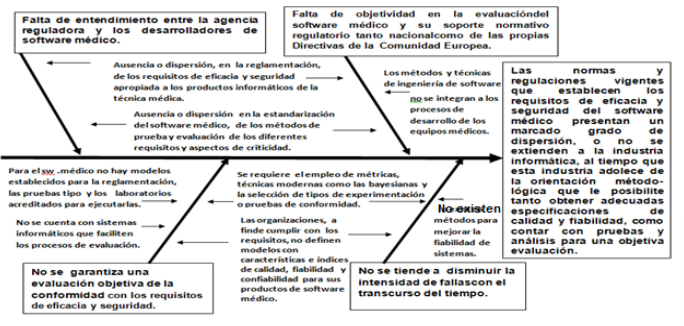 El propósito de la presente investigación es orientar adecuadamente a las entidades de la industria médico informática con un aseguramiento regulatorio y normativo, por medio de modelos a seguir para la aplicación de la ingeniería de software, privilegiando las características y sub-características de calidad, el riesgo y la seguridad en la salud, aunado a la fiabilidad y la gestión de la confiabilidad (véase (Santos & Febles, 2013)). Se prevé llegar hasta la aplicación de técnicas de inteligencia artificial basados en inferencias probabilísticas empleando métodos del teorema de Bayes, técnicas de softcomputing y otros (Littlewood, 2000; Arcury, 2012; Arza, 2013; Littlewood, 2013). Se introduce el término Ingeniería de Software Médico para el meta-modelo. Ya se habían utilizado con anterioridad por este autor técnicas como encuesta y entrevistas, a partir de lo cual se aplicó un diagrama de causa-efecto, para determinar las causas reales que provocaban el problema (Figura 2).