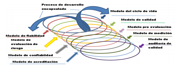 El meta-modelo de ingeniería de software médico se define conceptualmente como un conjunto de modelos que encapsulan el proceso de desarrollo de productos de software médico, de forma tal que esos productos se diseñen en conformidad con las normas y regulaciones establecidas para el sector y logren en consecuencia la efectividad, fiabilidad, calidad, seguridad, a partir de medidas de evaluación que se les exige (Figura 3). Cada modelo puede estar compuesto por una reglamentación determinada, de obligatorio cumplimiento para el desarrollador, y de otros documentos normativos y recomendados, como normas cubanas e internacionales y otras guías técnicas.