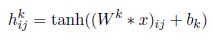 Mediante la implementación en las CNN de esta operación, un mapa de características se obtiene con la aplicación repetitiva del núcleo a través de subregiones de la imagen completa. Denotando el k −ésimo mapa de características como hk, cuyo filtro está determinado por los pesos Wk y el bias bk (2):