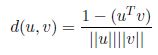 La distancia del coseno es una conocida medida de disimilitud empleada en la comparación de vectores, dados los vectores u y v de dimensión n, la distancia del coseno entre ellos se determina mediante la ecuación (3); en todos los casos se utiliza el producto punto:
